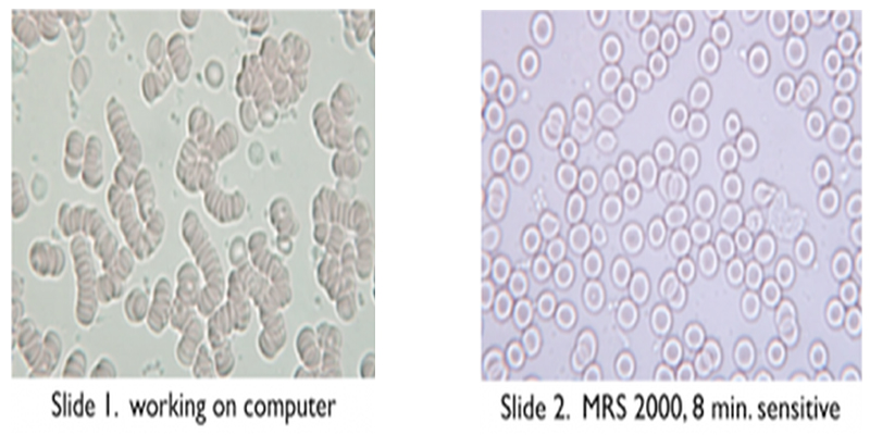 I did a live blood analysis after I worked on a computer. Then tested my blood after using the MRS 2000 mat for 8 minutes on a sensitive setting (low intensity) and found–to my surprise–that my blood cells looked much healthier. They were no longer sticking together. See slides 1 and 2 below. I repeated this several times and found virtually identical results. This was encouraging.