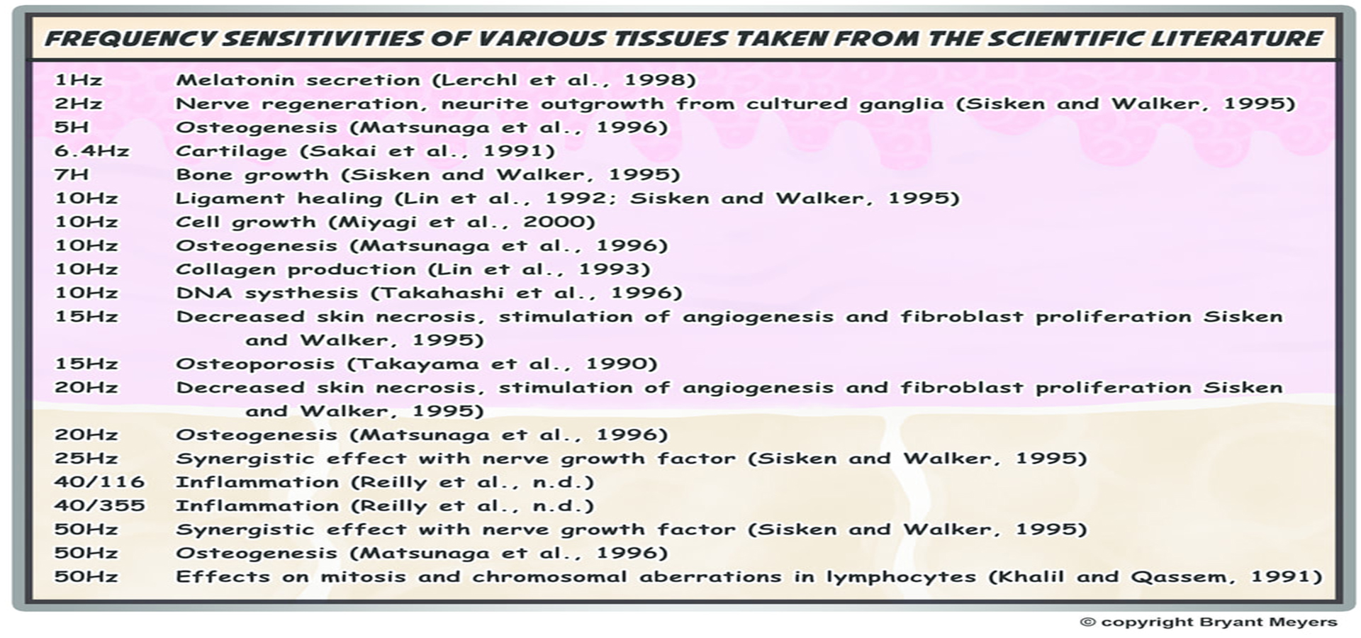 At the level of tissues, the same 0-50 Hz frequency range has been shown to have the most positive benefits on the human body. The Table to the left lists frequencies in the 0-50 Hz that biomedical researchers are finding that are effective for jump starting healing in a variety of soft and hard tissues.