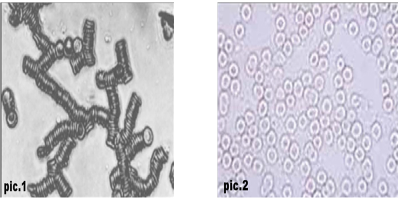 Figure 1. Photographs of a live blood sample before (slide 1) and after (slide 2) an MRS 2000 treatment.